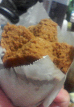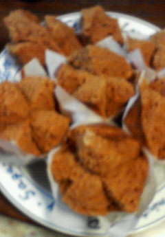 ちなみこれが出来上がったもの。分かりやすいよう、手に持って撮影してみました(ケータイカメラで)。ちなみに右は、お皿に入ったいくつかの蒸しパンです。ちなみに画像をクリックすると拡大します。